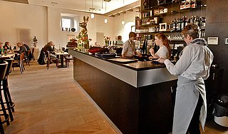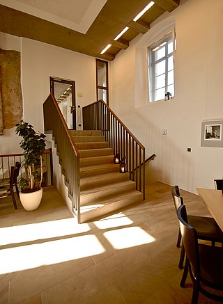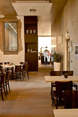 Im ehemaligen Zisterzienserkloster und dem heutigen Kunsthaus verbinden sich Geschichte und Tradition mit zeitgenössischer Kunst. Diese Verbindung spiegelt sich im Ambiente des Cafés wider. Eine moderne Ausstattung lädt Sie zum Verweilen nach einem Besuch des Kunsthauses oder zu einer Rast nach einer Rad- oder Wandertour ein. Genießen Sie die schönen Außenplätze auf der Sonnenterasse oder im Klosterinnenhof. Die natürliche Umgebung mit Wiesen, Gärten, Skulpturen, Gräften, der Klosterkirche und der alten Klostermühle laden zu einem erholsamen Spaziergang auf dem parkähnlichen Außengelände ein.